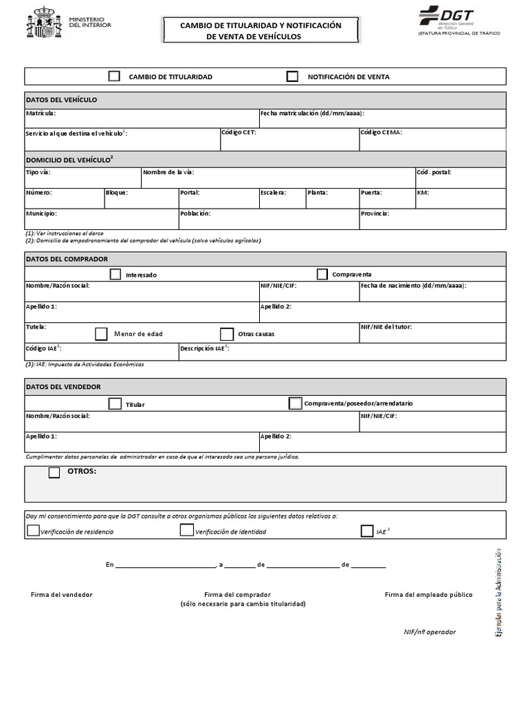 Cmo cambiar el titular de un vehculo - DGT Si usted es el comprador, deber presentar en su Jefatura de Trfico (recuerde pedir cita previa - Impreso de solicitud de cambio de titularidad del vehculo cumplimentado. DNI, tarjeta de residencia, pasaporte o permiso de conduccin espaol del comprador (original) y del vendedor.